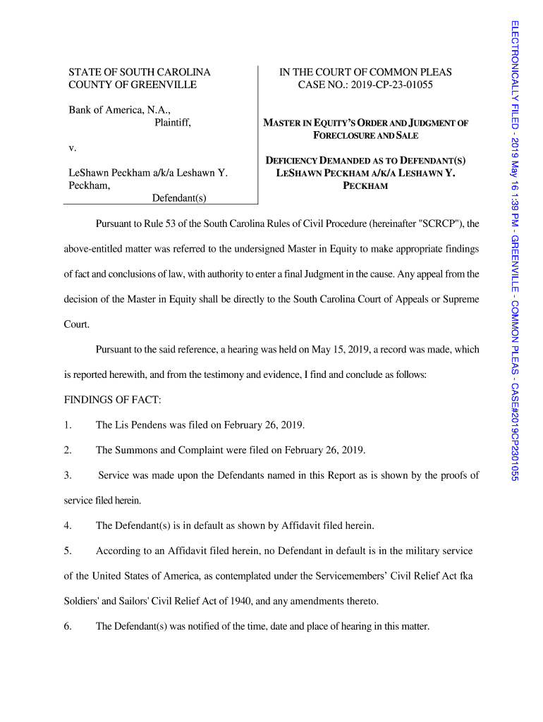 Bank of America, N.A., Plaintiff, IN THE COURT OF COMMON PLEAS CASE NO.: 2019CP2301055 MASTER IN EQUITY ORDER AND JUDGMENT OF FORECLOSURE AND Sale. Le Shawn Peck ham a/k/a DeShawn Y. Peck ham, Defendant(s)DEFICIENCY