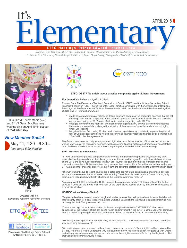 APRIL 2018ETFO, OS STF file unfair labor practice complaints against Liberal Government For Immediate Release April 13, 2018, Toronto, ON The Elementary Teachers Federation of Ontario (ETF) and the