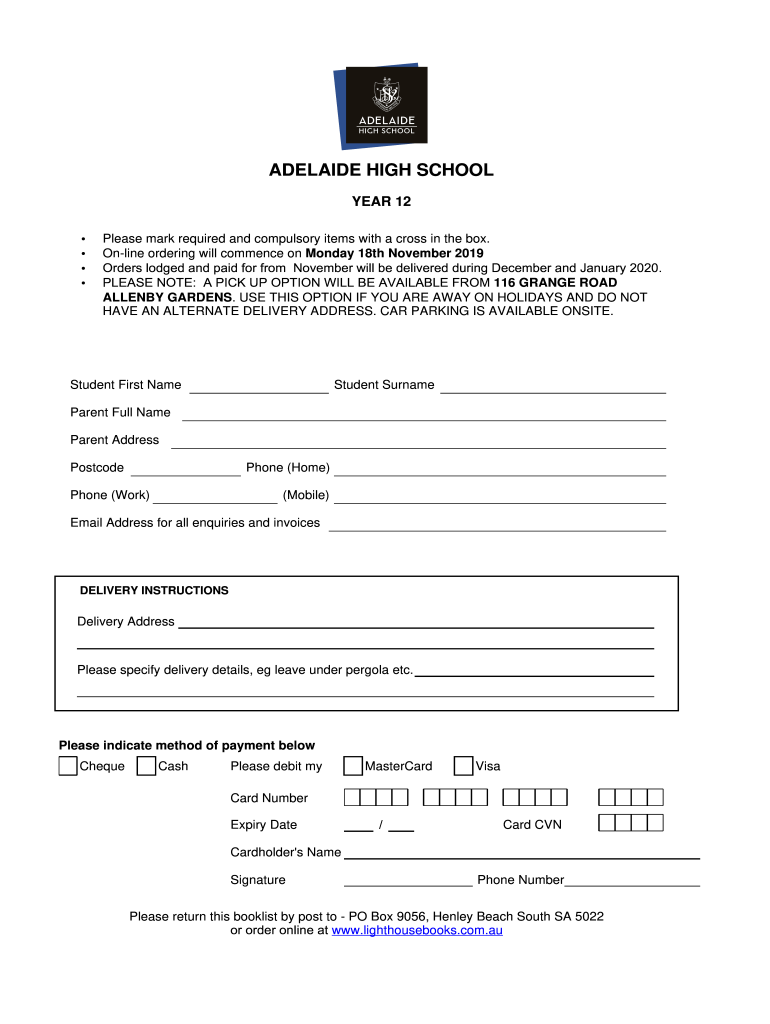ADELAIDE HIGH SCHOOL YEAR 12 Please mark required and compulsory items with a cross in the box. Online ordering will commence on Monday 18th November 2019 2UGHUVORGJHGDQGSDLGIRUIURP1RYHPEHUZLOOEHGHOLYHUHGGXULQJ