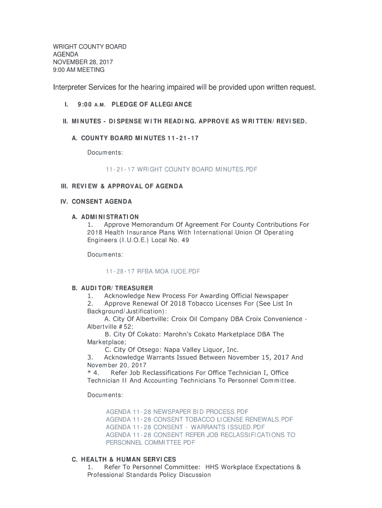 WRIGHT COUNTY BOARD AGENDA NOVEMBER 28, 2017 9:00 AM MEETINGInterpreter Services for the hearing impaired will be provided upon written request. I.9:00A. M.PLEDGE OF ALLEGIANCE. MINUTES DISPENSE WITH