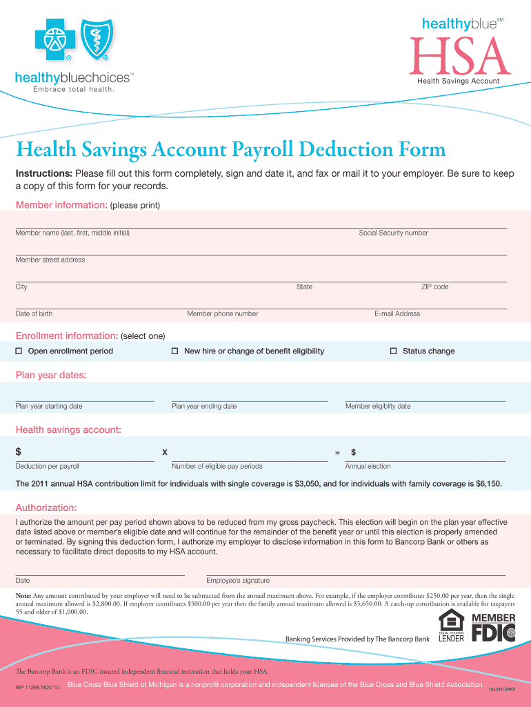 HSA Health Savings Account Payroll Deduction Form Instructions: Please fill out this form completely, sign and date it, and fax or mail it to your employer. Be sure to keep a copy of this form for