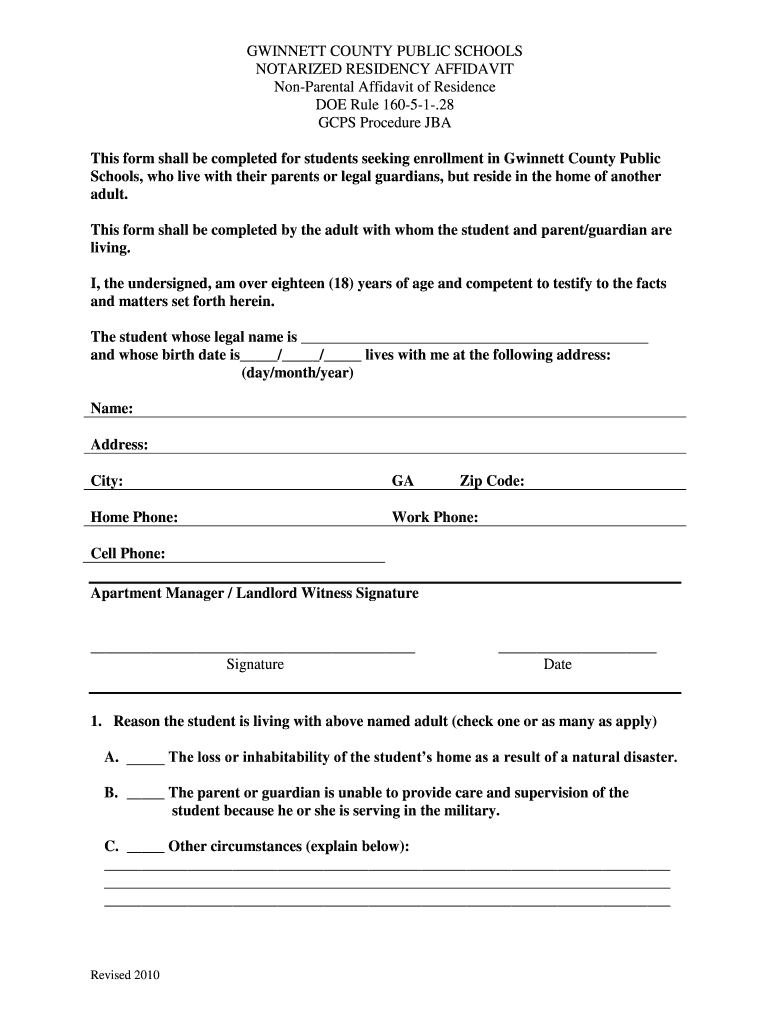GWINNETT COUNTY PUBLIC SCHOOLS. NOTARIZED RESIDENCY AFFIDAVIT. Non-Parental Affidavit of Residence. DOE Rule 160-5-1-.28. GPS Procedure ...