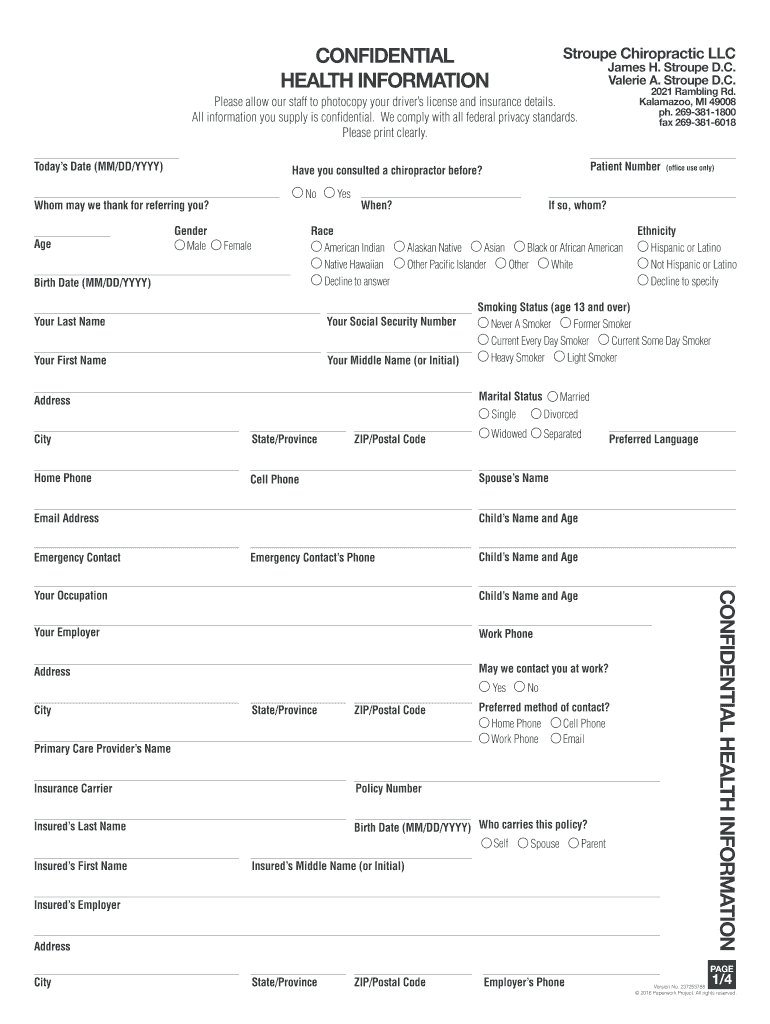 CONFIDENTIAL HEALTH INFORMATIONStroupe Chiropractic LLC James H. Troupe D.C. Valerie A. Troupe D.C. 2021 Rambling Rd. Kalamazoo, MI 49008 pH. 2693811800 fax 2693816018Please allow our staff to photocopy