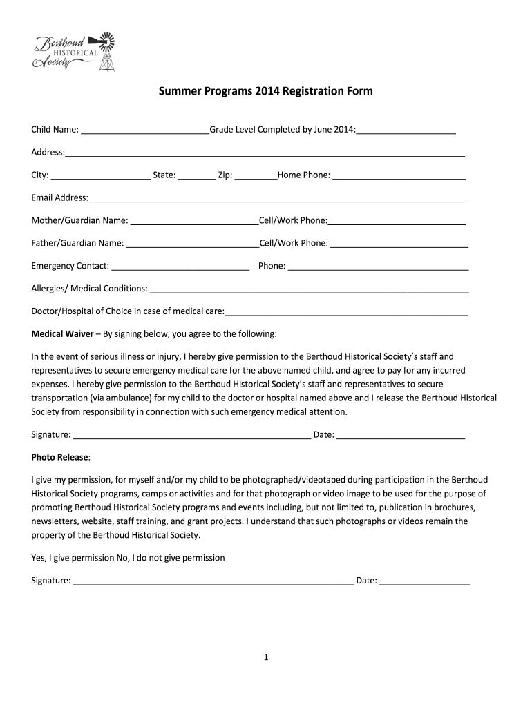 Summer Programs 2014 Registration Form Child Name: Grade Level Completed by June 2014: Address: City: State: Zip: Home Phone: Email Address: Mother/Guardian Name: Cell/Work Phone: Father/Guardian