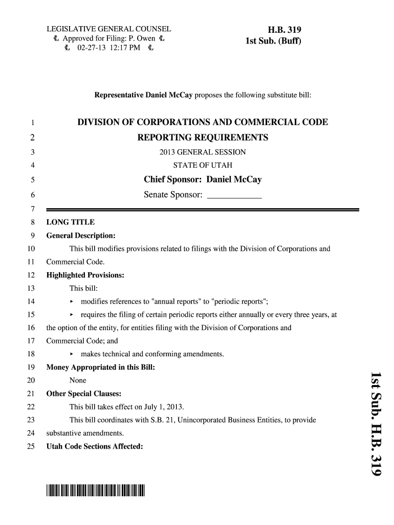 LEGISLATIVE GENERAL COUNSEL 6 Approved for Filing: P. Owen 6 6 022713 12:17 PM 6H. B. 319 1st Sub. (Buff)Representative Daniel McCoy proposes the following substitute bill:1DIVISION OF CORPORATIONS