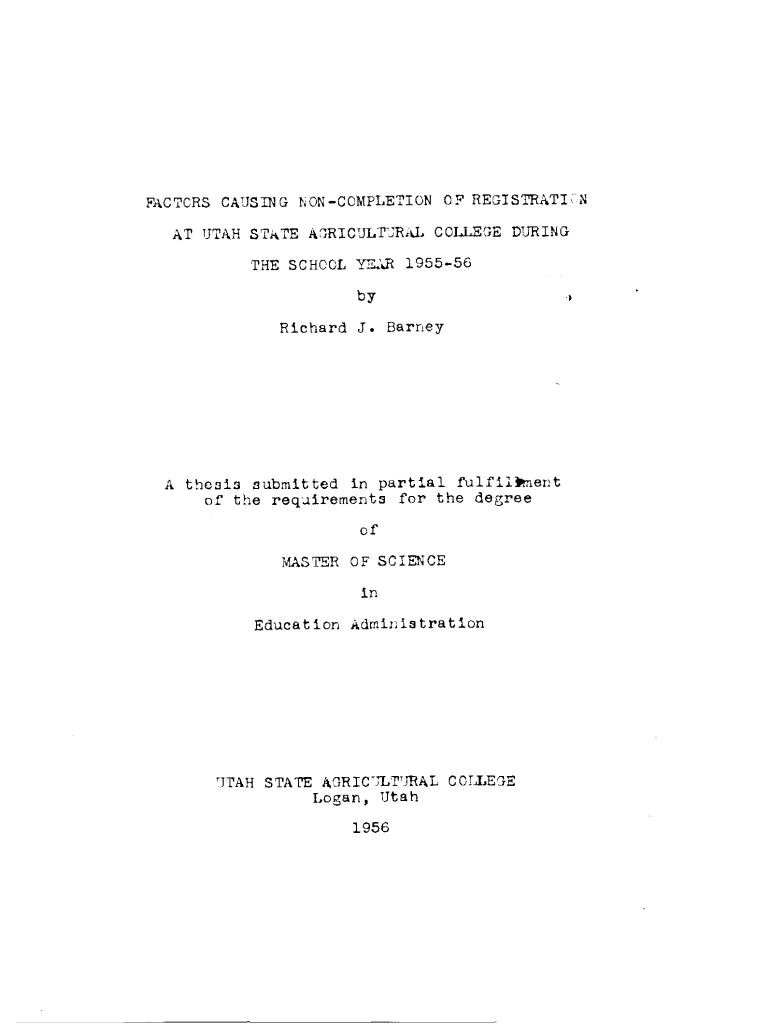 FACTORS CAUSING incompletion OF REGISTRATION N AT UTAH STATEARICULTJR&.COLLEGE DURING SCHOOL YE. 'JT 195556by Richard J. Barney At!:Submitted in partial fulfill. Next of the req:.1irements for the