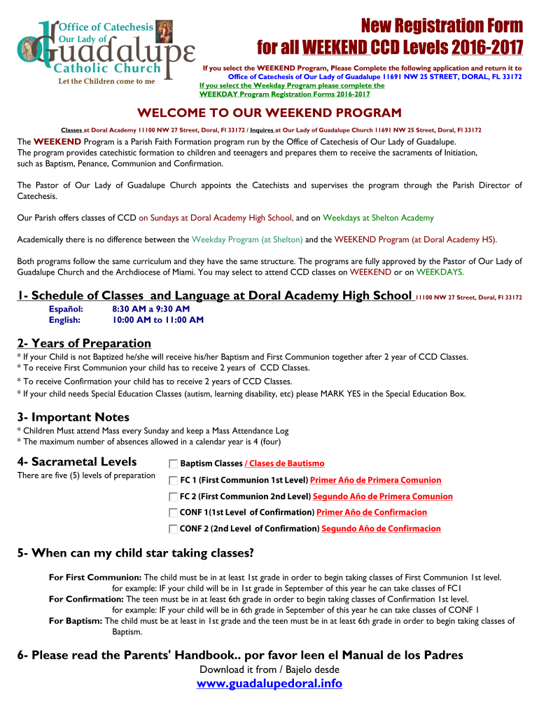 New Registration Form for all WEEKEND CCD Levels 20162017 If you select the WEEKEND Program, Please Complete the following application and return it to Office of Catechisms of Our Lady of Guadalupe