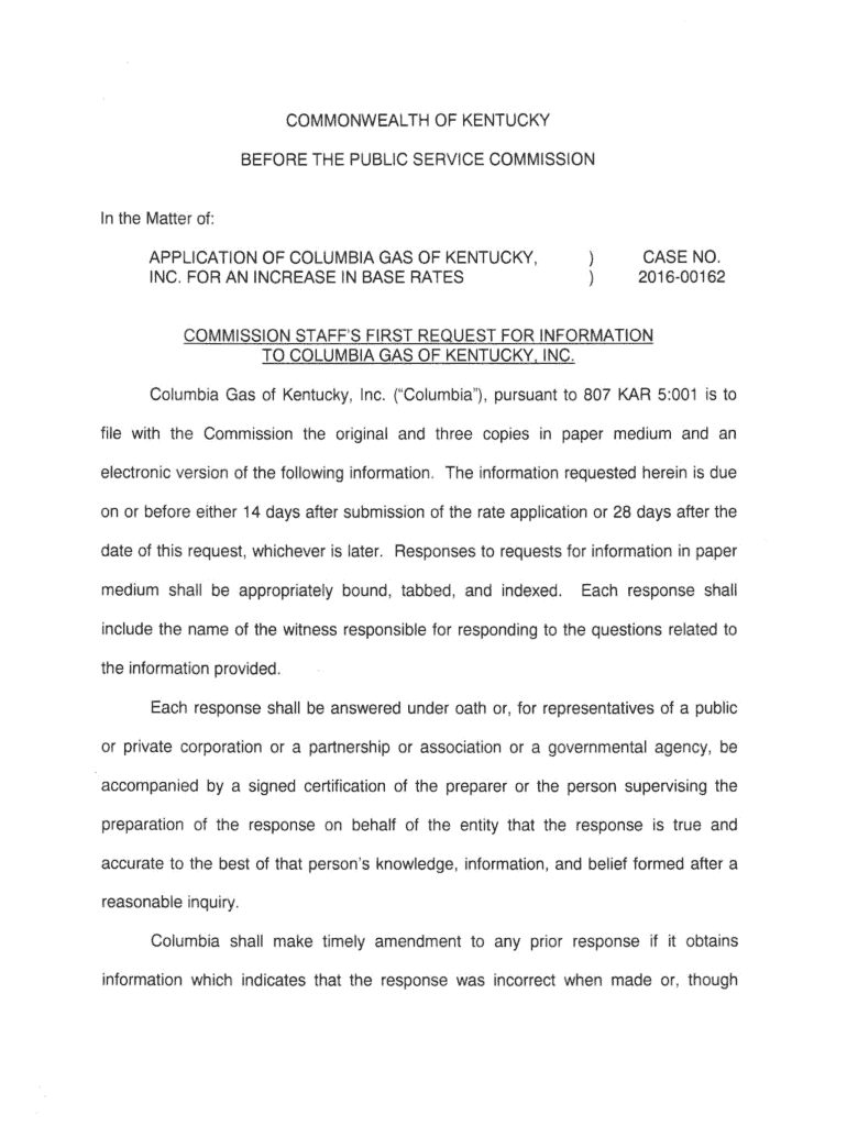 COMMONWEALTH OF KENTUCKY BEFORE THE PUBLIC SERVICE Commissioning the Matter of: APPLICATION OF COLUMBIA GAS OF KENTUCKY, INC. FOR AN INCREASE IN BASE RATES CASE NO. 201600162COMMISSION STAFF IS FIRST