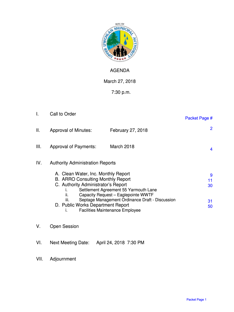 AGENDA March 27, 2018 7:30 p.m.I. Call to Order. Approval of Minutes:February 27, 2018III. Approval of Payments:March 2018IV. Authority Administration ReportsPacket Page # 24A. Clean Water, Inc. Monthly