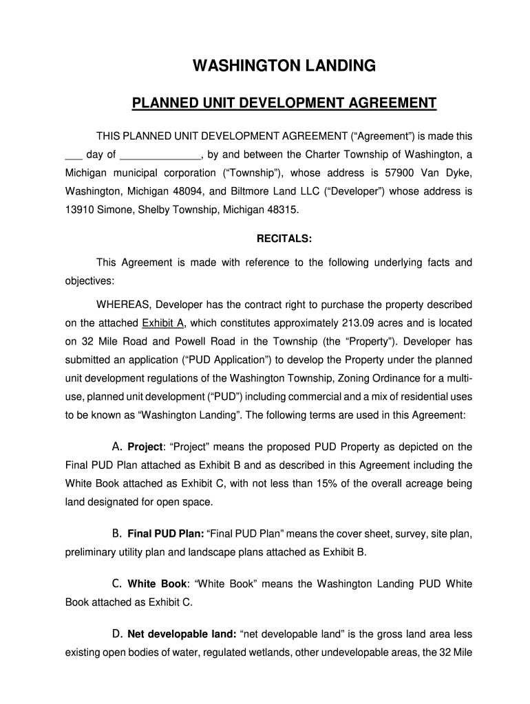 WASHINGTON LANDING PLANNED UNIT DEVELOPMENT AGREEMENT THIS PLANNED UNIT DEVELOPMENT AGREEMENT (Agreement) is made this day of, by and between the Charter Township of Washington, a Michigan municipal