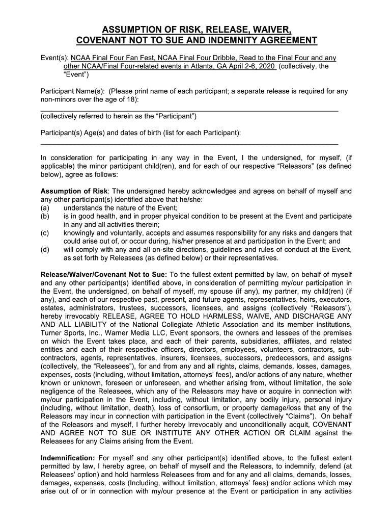 ASSUMPTION OF RISK, RELEASE, WAIVER, COVENANT NOT TO SUE AND INDEMNITY AGREEMENT Event(s): NCAA Final Four Fan Fest, NCAA Final Four Dribble, Read to the Final Four and any other NCAA/Final Four related