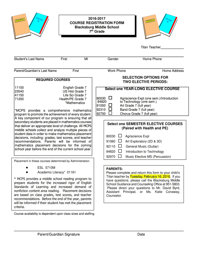 Get the free COURSE REGISTRATION FORM Blacksburg Middle School Grade Flex ...