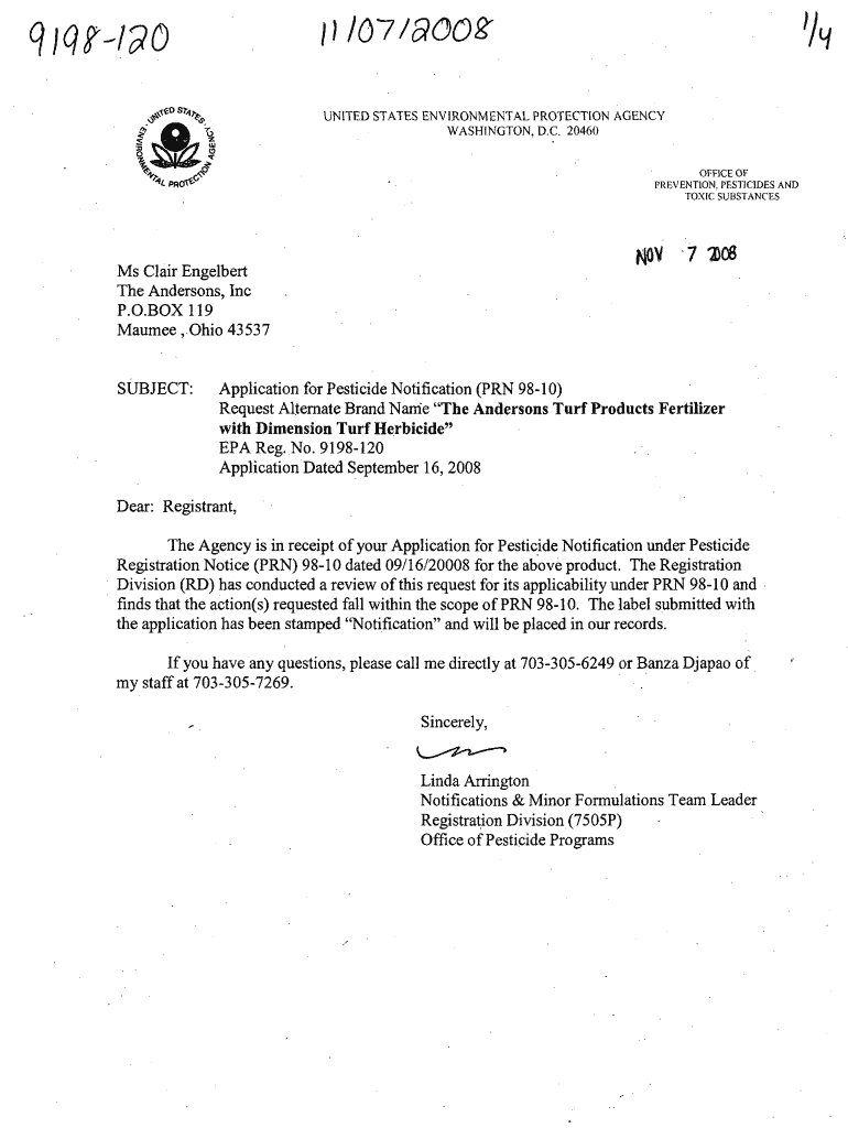 'ILL UNITED STATES ENVIRONMENTAL PROTECTION AGENCY WASHINGTON, D.C. 20460OFFICE OF PREVENTION, PESTICIDES AND TOXIC SUBSTANCE 'SNOW '7 1)08Ms Clair Gilbert The Anderson's, Inc P.O.BOX 119 Maumee,