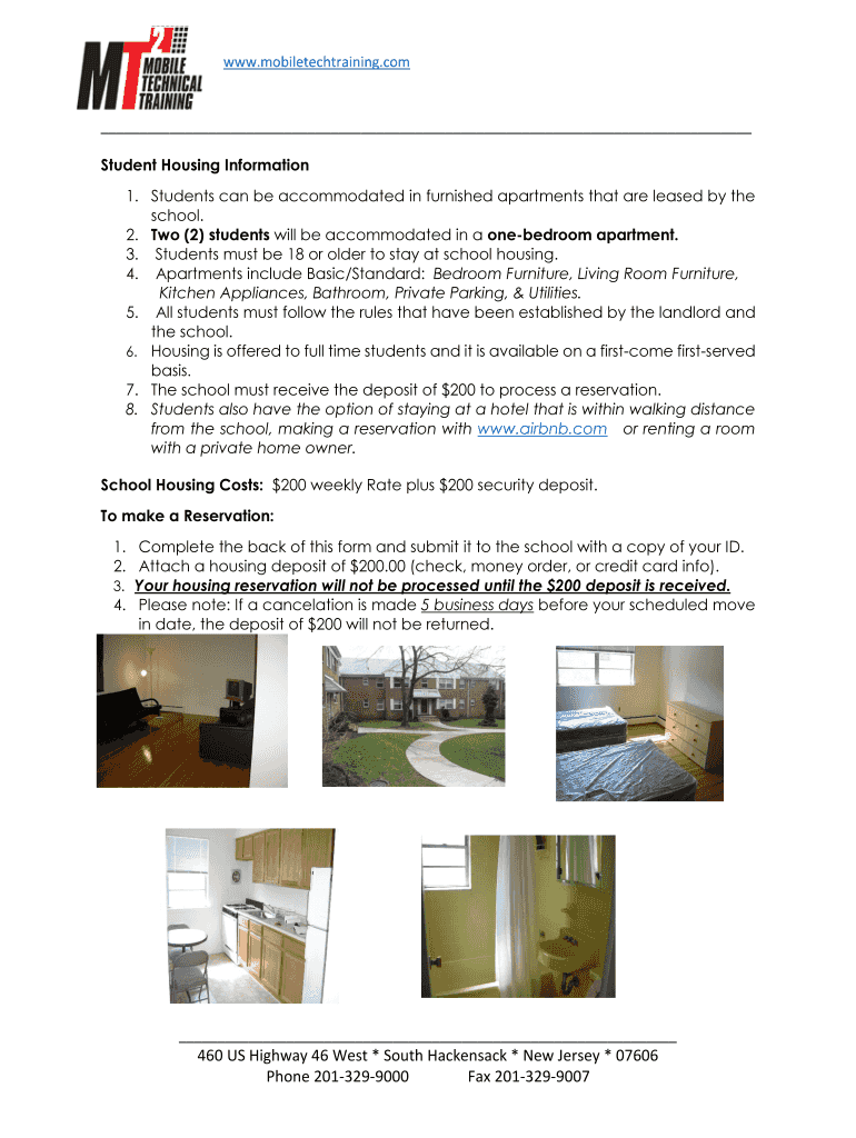 WWW.mobiletechtraining.com Student Housing Information 1. Students can be accommodated in furnished apartments that are leased by the school. 2. Two (2) students will be accommodated in a one-bedroom