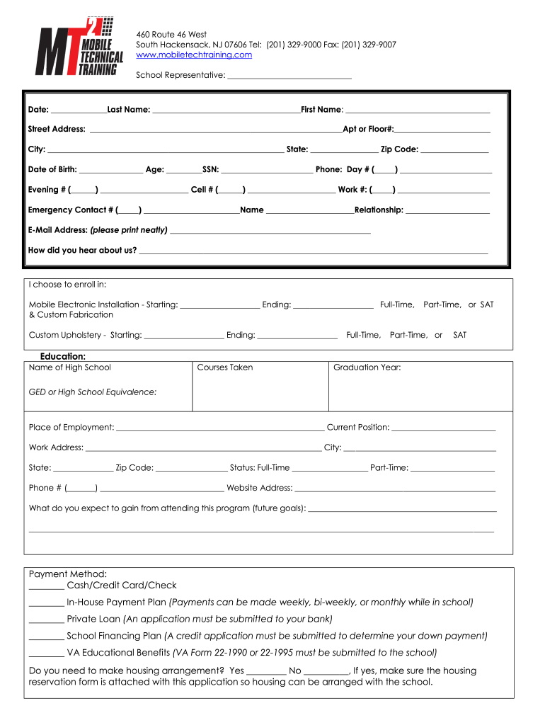 460 Route 46 West South Hackensack, NJ 07606 Tel: (201) 3299000 Fax: (201) 3299007 www.mobiletechtraining.com School Representative: Date: Last Name: First Name: Street Address: Apt or Floor#: City: