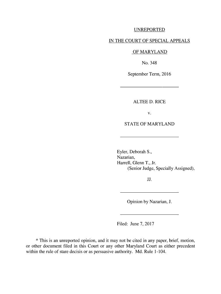 UNREPORTED IN THE COURT OF SPECIAL APPEALS OF MARYLAND No. 348 September Term, 2016 ALTER D. RICE v. STATE OF MARYLAND Tyler, Deborah S., Bavarian, Harrell, Glenn T., Jr. (Senior Judge, Specially
