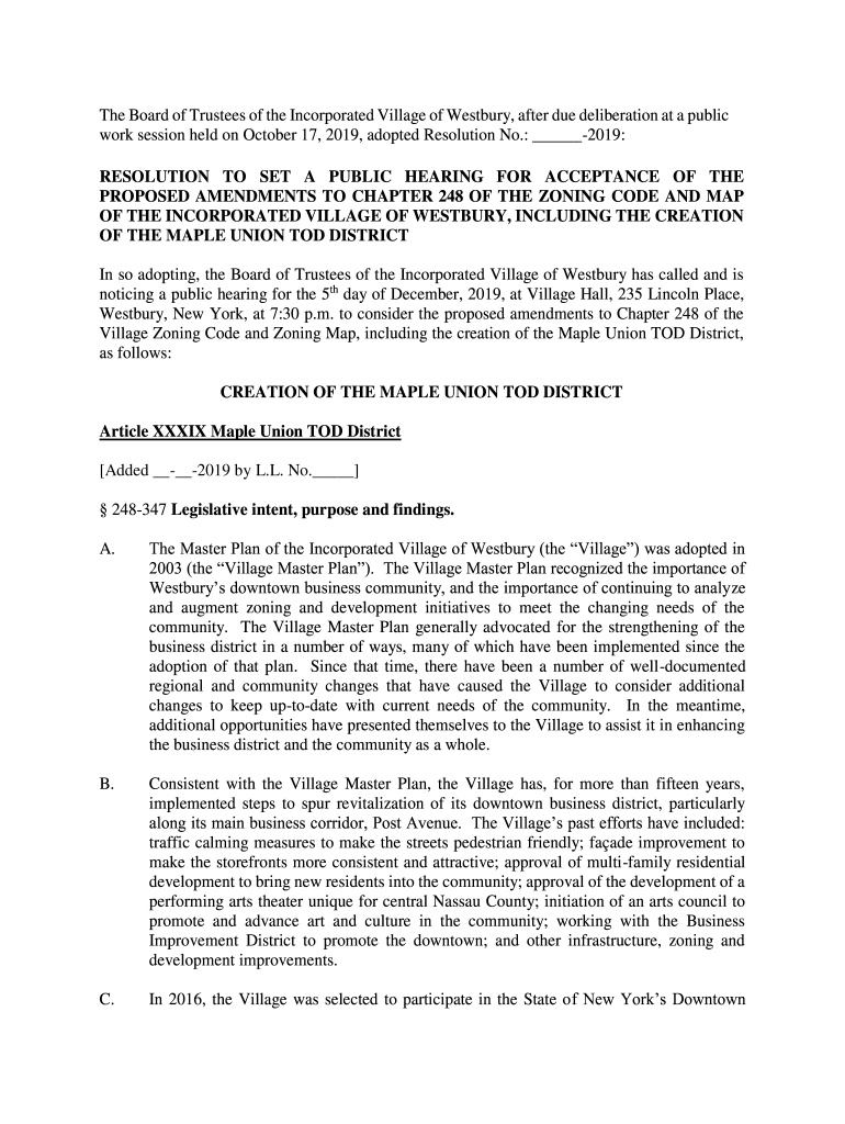 The Board of Trustees of the Incorporated Village of West bury, after due deliberation at a public work session held on October 17, 2019, adopted Resolution No.: 2019: RESOLUTION TO SET A PUBLIC HEARING