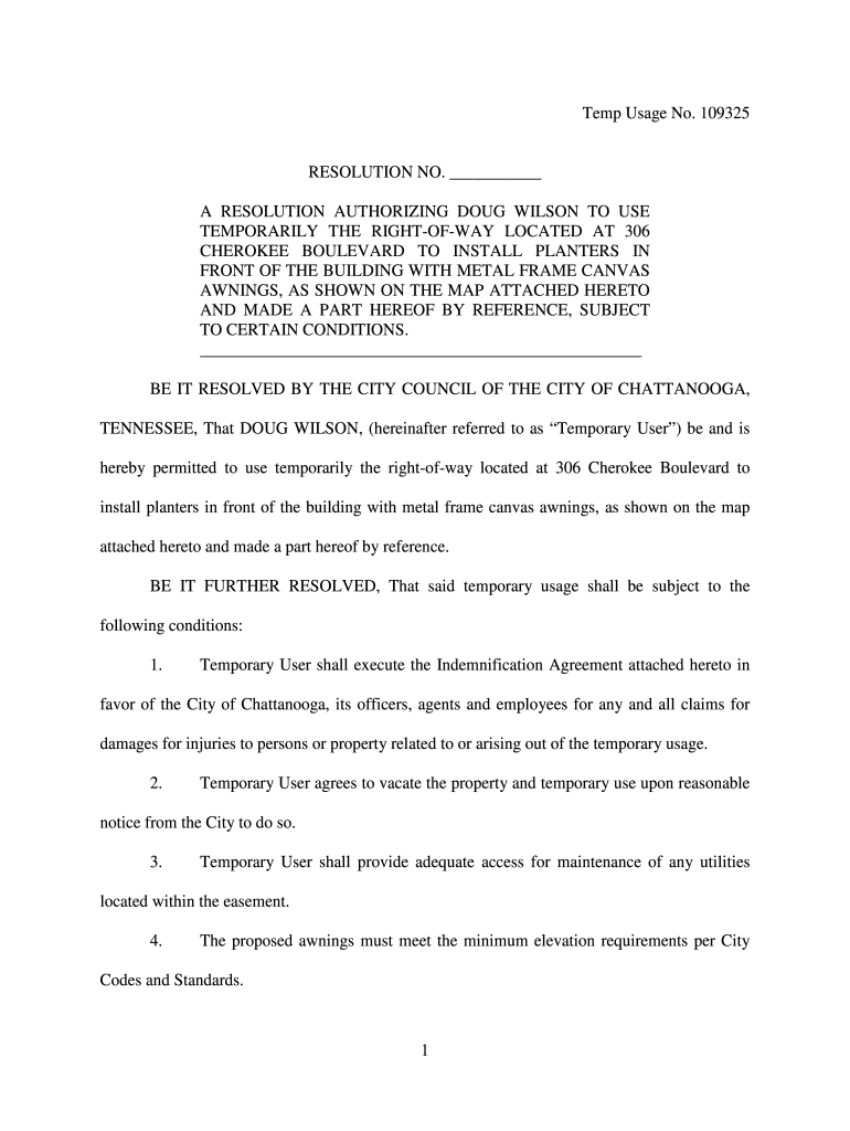 Temp Usage No. 109325RESOLUTION NO. A RESOLUTION AUTHORIZING DOUG WILSON TO USE TEMPORARILY THE RIGHTOFWAY LOCATED AT 306 CHEROKEE BOULEVARD TO INSTALL PLANTERS IN FRONT OF THE BUILDING WITH METAL