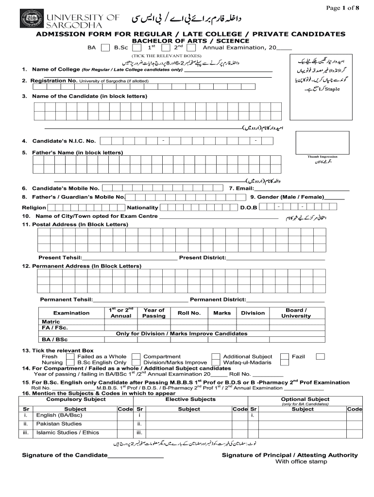 Page 1 of 8 ADMISSION FORM FOR REGULAR / LATE COLLEGE / PRIVATE CANDIDATES BACHELOR OF ARTS / SCIENCE. Sc1st2nd(TICK THE RELEVANT BOXES)Annual Examination, 20 1. Name of College (for Regular / Late