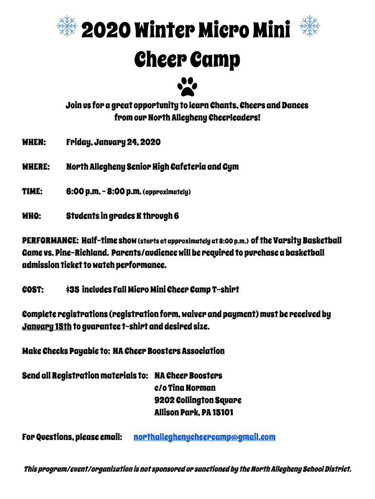 2020 Winter Micro Mini Cheer Campaign us for a great opportunity to learn Chants, Cheers and Dances from our North Allegheny Cheerleaders! Friday, January 24, 2020WHEN: WHERE: North Allegheny Senior