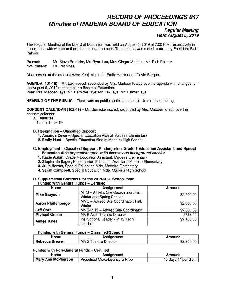 RECORD OF PROCEEDINGS 047 Minutes of MADEIRA BOARD OF EDUCATION Regular Meeting Held August 5, 2019, The Regular Meeting of the Board of Education was held on August 5, 2019, at 7:00 P.M. respectively