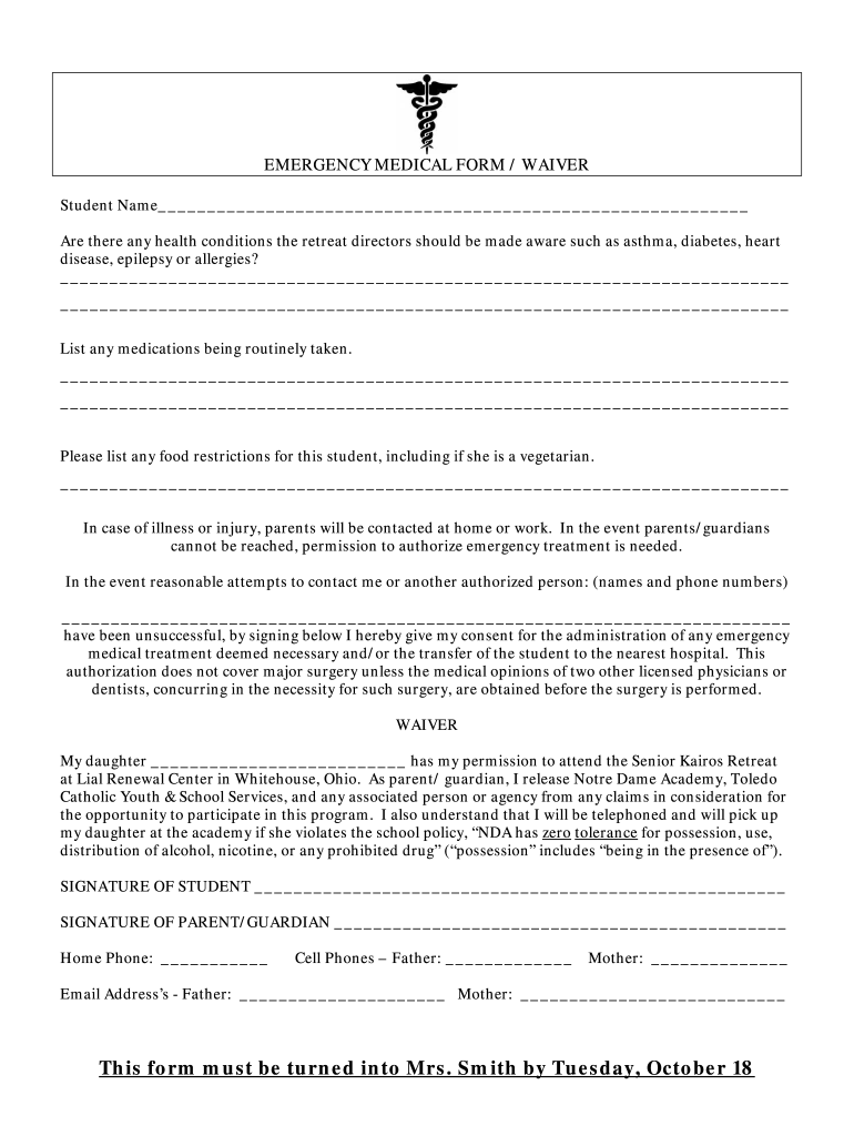 EMERGENCY MEDICAL FORM / WAIVER Student Name Are there any health conditions the retreat directors should be made aware such as asthma, diabetes, heart disease, epilepsy or allergies? List any medications