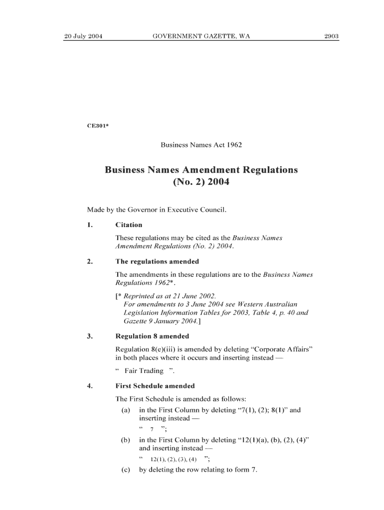 GOVERNMENT GAZETTE, WA20. July 2001CE301×Business Names Act 1962Business Names Amendment Regulations (No. 2) 2004 Made by the Governor in Executive Council. 1. Citation These regulations may be cited