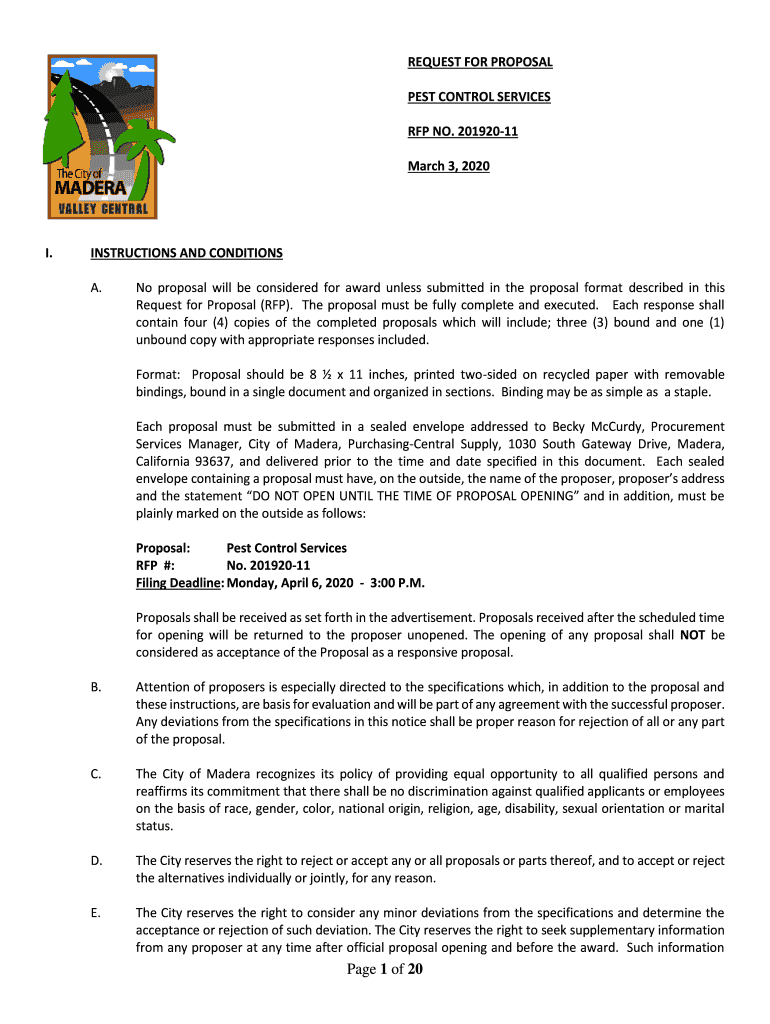 REQUEST FOR PROPOSAL PEST CONTROL SERVICES RFP NO. 20192011 March 3, 2020I.INSTRUCTIONS AND CONDITIONS A. No proposal will be considered for award unless submitted in the proposal format described