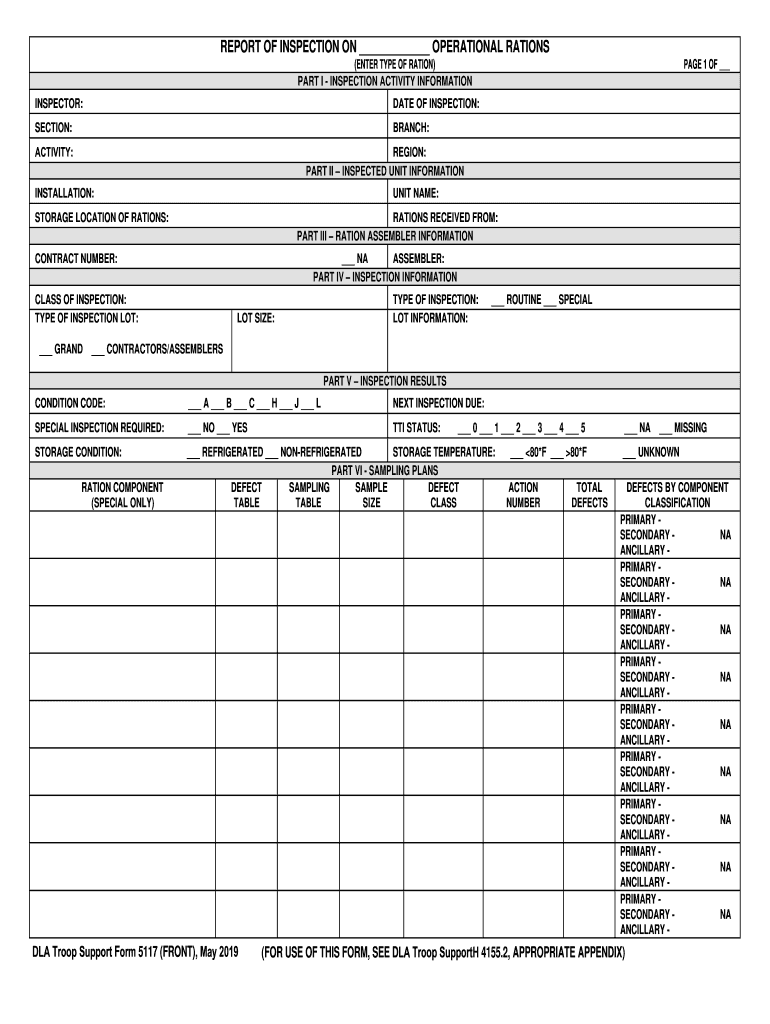 REPORT OF INSPECTION ON OPERATIONAL RATIONS (ENTER TYPE OF RATION) PART I INSPECTION ACTIVITY INFORMATION INSPECTOR: DATE OF INSPECTION: SECTION: BRANCH: ACTIVITY: REGION: P PART II INSPECTED UNIT