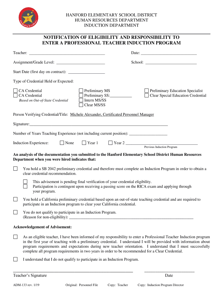 HANFORD ELEMENTARY SCHOOL DISTRICT HUMAN RESOURCES DEPARTMENT INDUCTION DEPARTMENTNOTIFICATION OF ELIGIBILITY AND RESPONSIBILITY TO ENTER A PROFESSIONAL TEACHER INDUCTION PROGRAM Teacher:Date:Assignment/Grade