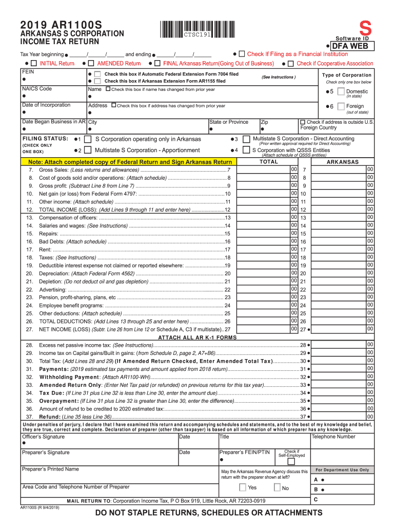 CLEAR FOOTPRINT FORMS2019 AR1100SARKANSAS S CORPORATION INCOME TAX RETURN Tax Year beginning / / and endingINITIAL ReturnAMENDED ReturnFEINCTSC191Software ID DFA Recheck If Filing as a Financial Institution