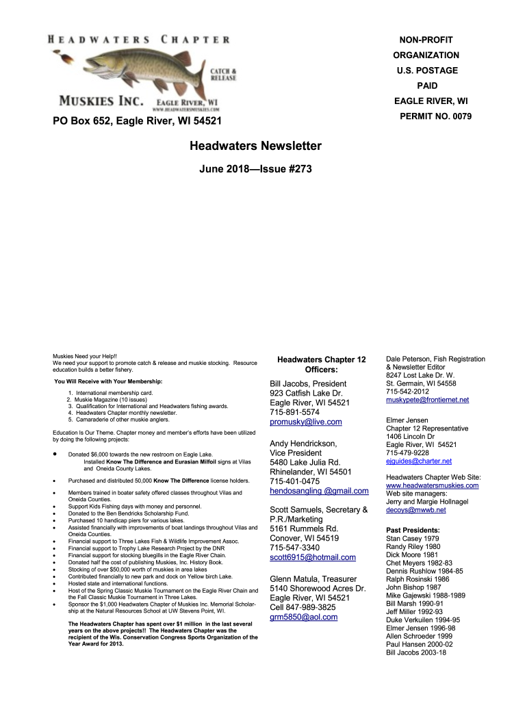 NONPROFIT ORGANIZATION U.S. POSTAGE PAID EAGLE RIVER, WI PERMIT NO. 0079PO Box 652, Eagle River, WI 54521Headwaters Newsletter June 2018Issue #273Muskies Need your Help!! We need your support to promote