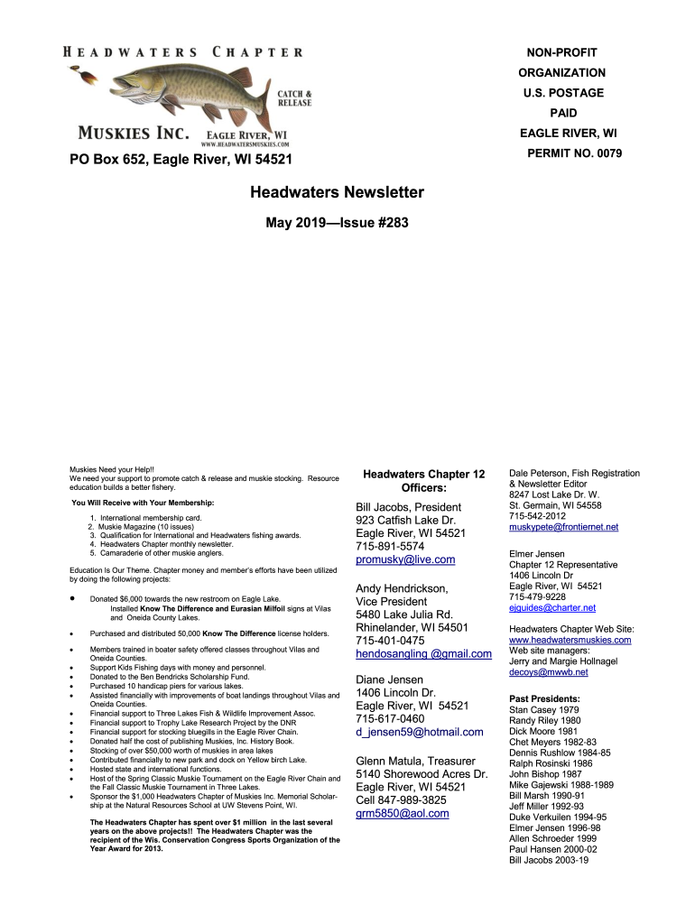 NONPROFIT ORGANIZATION U.S. POSTAGE PAID EAGLE RIVER, WI PERMIT NO. 0079PO Box 652, Eagle River, WI 54521Headwaters Newsletter May 2019Issue #283Muskies Need your Help!! We need your support to promote