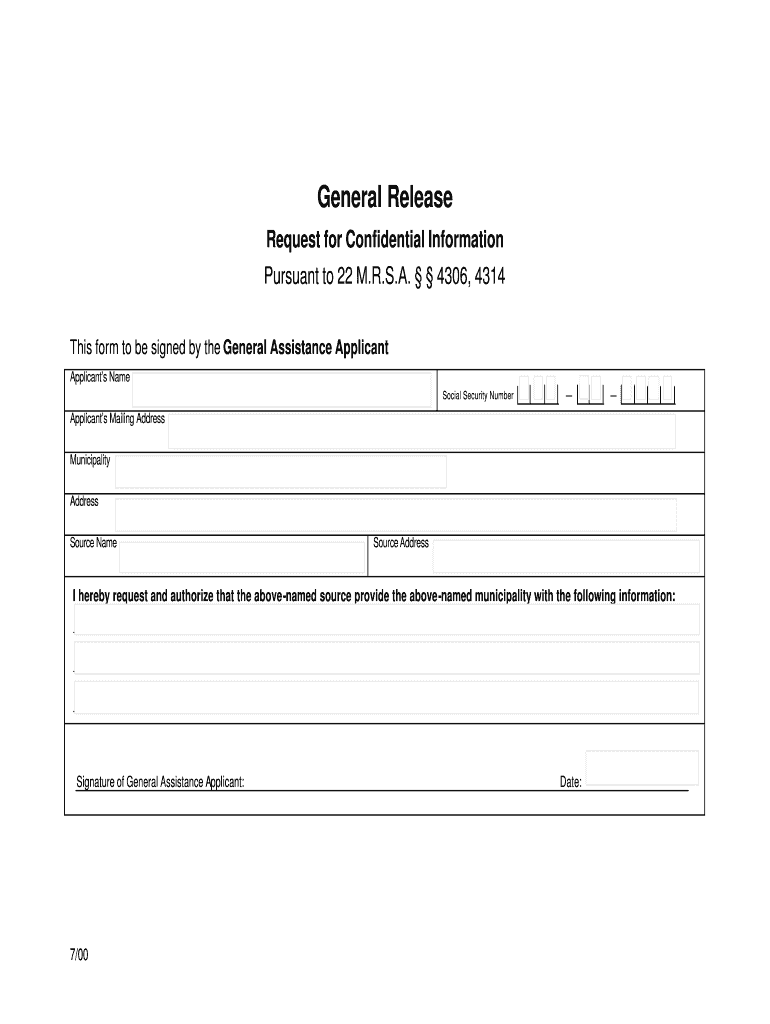 The General Assistance Information Request Form is a government document used by applicants in Maine to authorize the release of confidential information for General Assistance purposes.