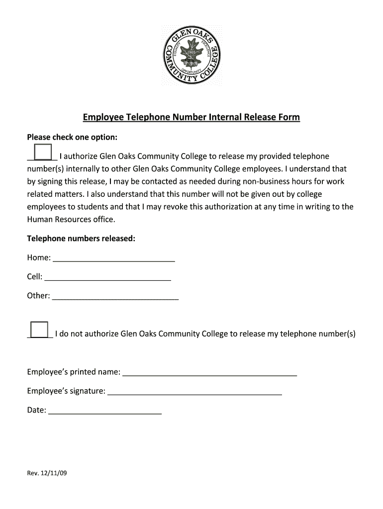 Any employee of Glen Oaks Community College can complete this form to authorize or deny the release of their telephone number for internal purposes.