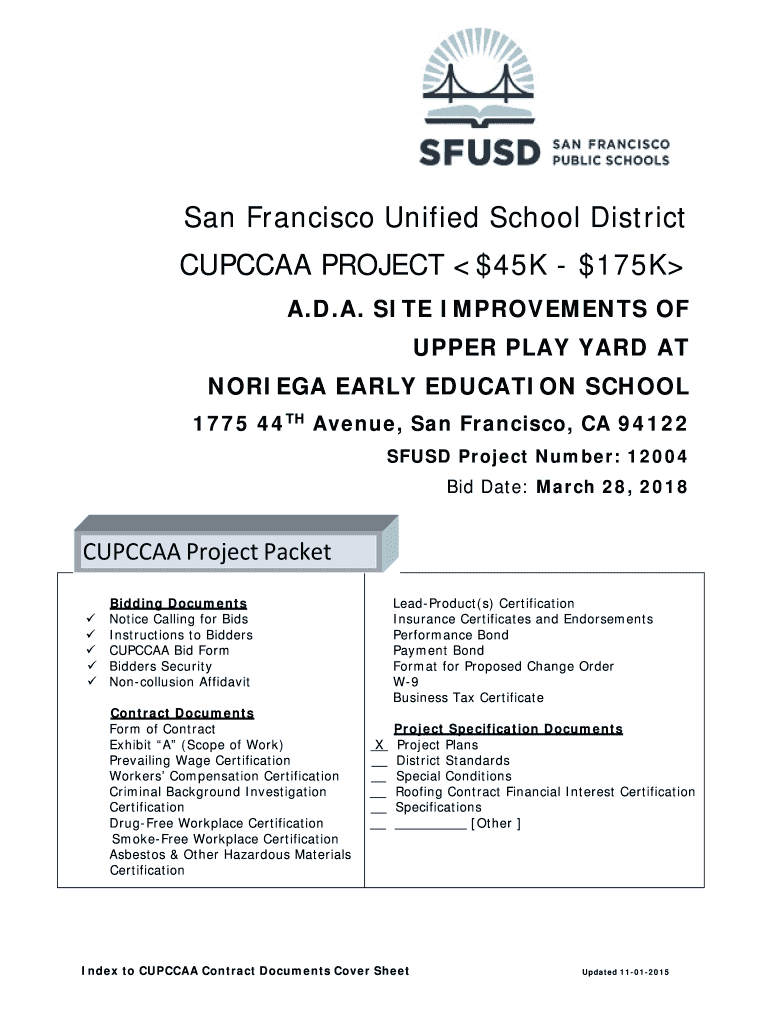 San Francisco Unified School DistrictCUPCCAA PROJECT $45K $175K A.D.A. SITE IMPROVEMENTS OF UPPER PLAY YARD AT NORIEGA EARLY EDUCATION SCHOOL 1775 44TH Avenue, San Francisco, CA 94122 SF USD Project