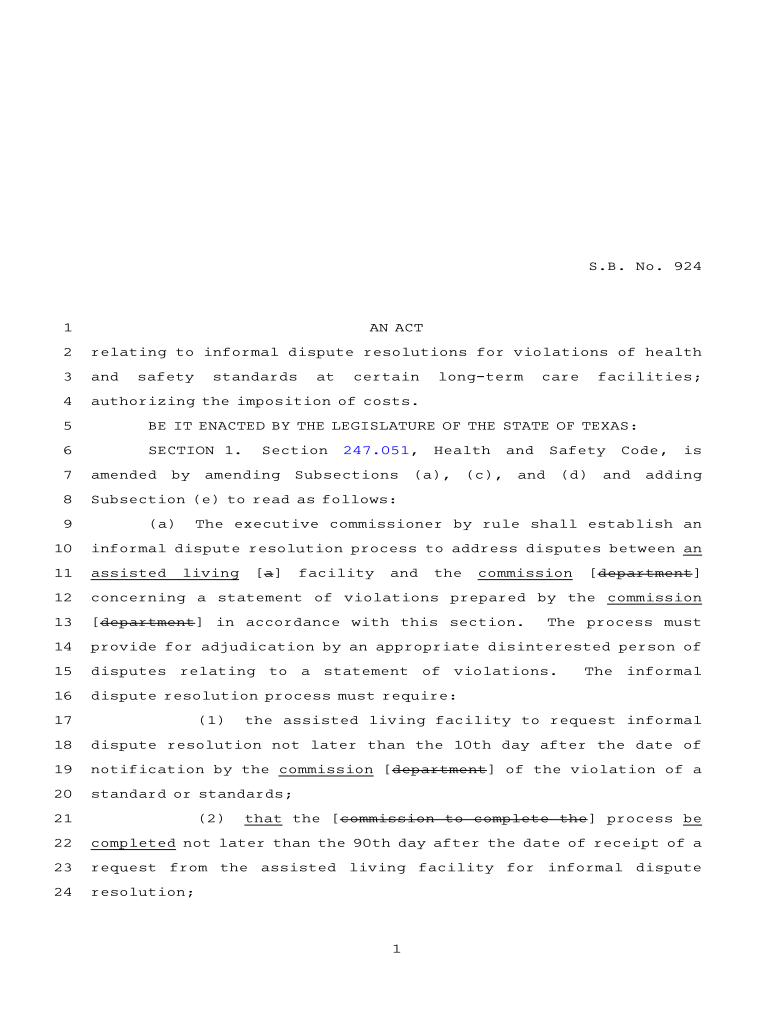 S.B.ANO. A9241AN ACT2relating to informal dispute resolutions for violations of health3and4authorizing the imposition of costs.safetystandardsatcertainlongtermcarefacilities;5BE IT ENACTED BY THE