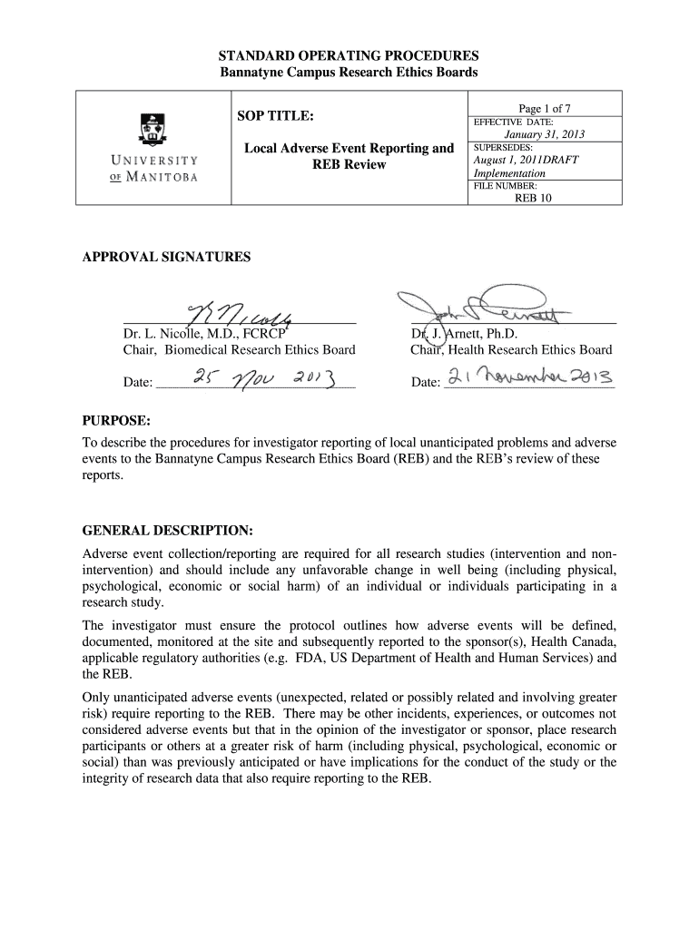 STANDARD OPERATING PROCEDURES Ballantyne Campus Research Ethics Boards Page 1 of 7SOP TITLE:EFFECTIVE DATE:January 31, 2013Local Adverse Event Reporting and RED ReviewSUPERSEDES:August 1, 2011DRAFT