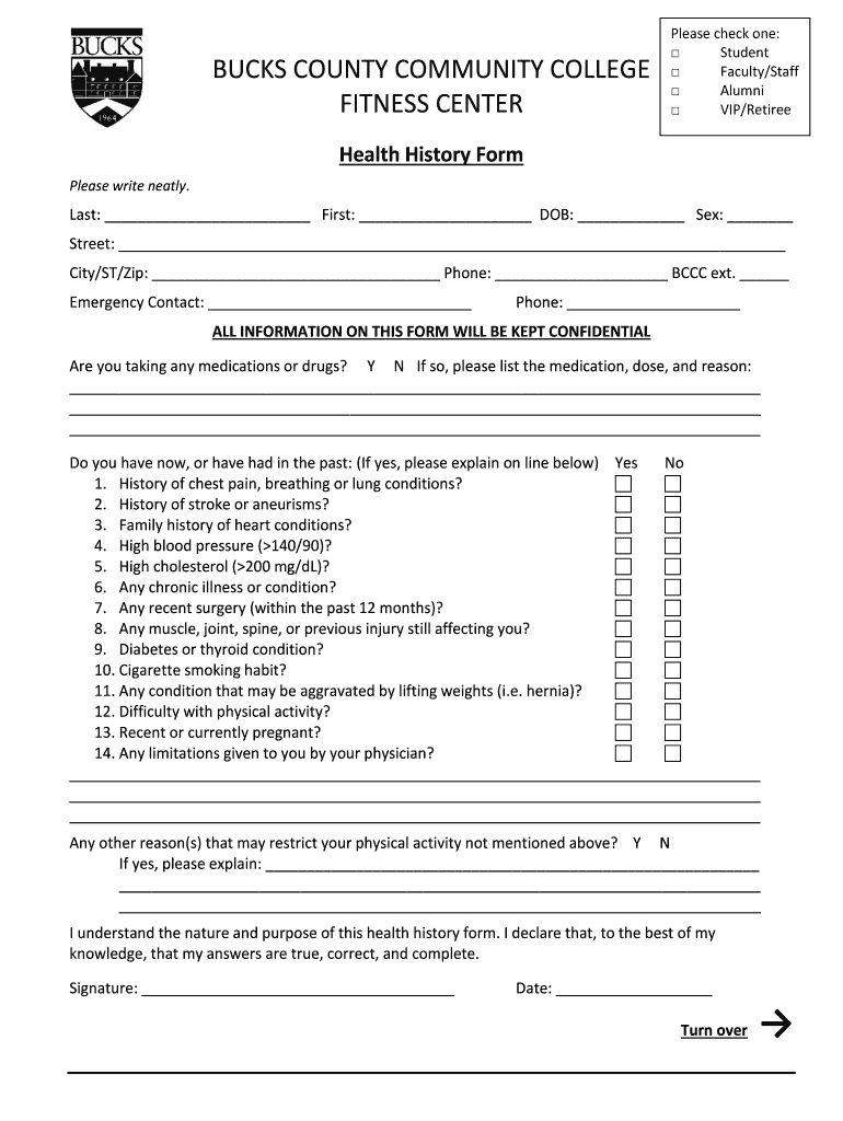 BUCKS COUNTY COMMUNITY COLLEGE FITNESS Centerpiece check one: Student Faculty/Staff Alumni VIP/RetireeHealth History Form Please write neatly. Last: First: DOB: Sex: Street: City/ST/Zip: Phone: CCC