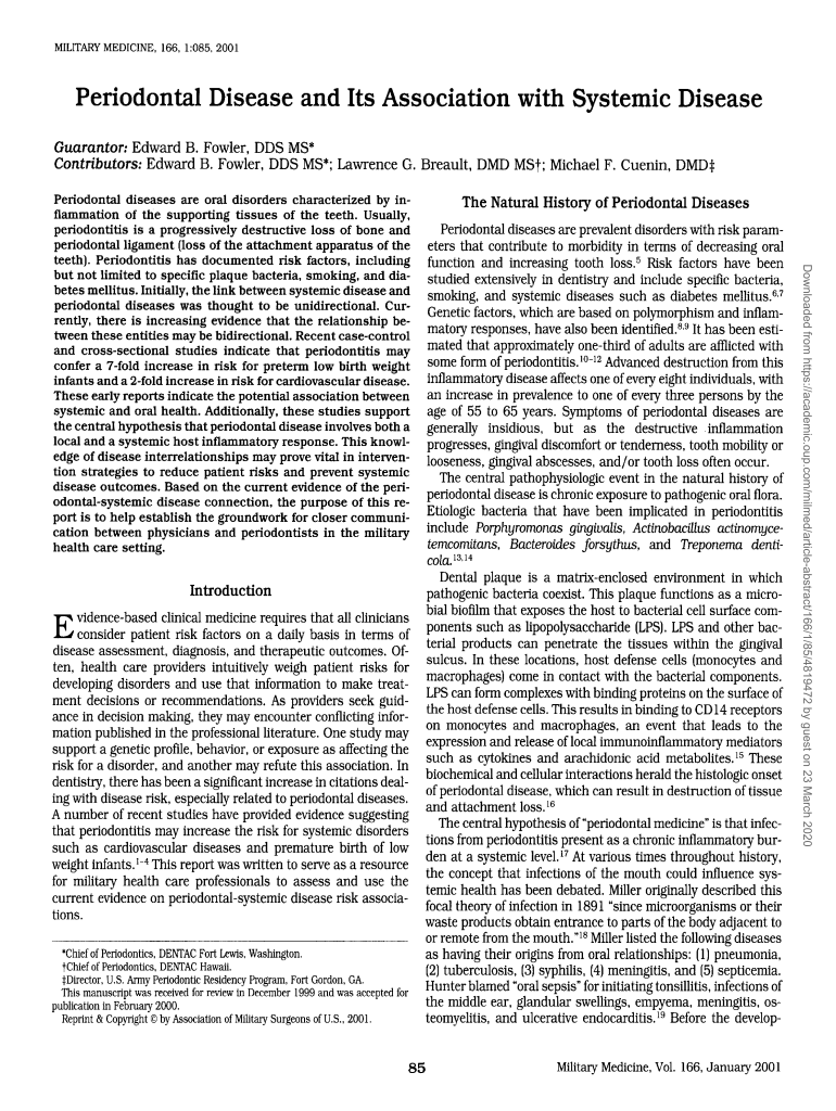 MILITARY MEDICINE, 166, 1:085,2001Periodontal Disease and Its Association with Systemic Disease