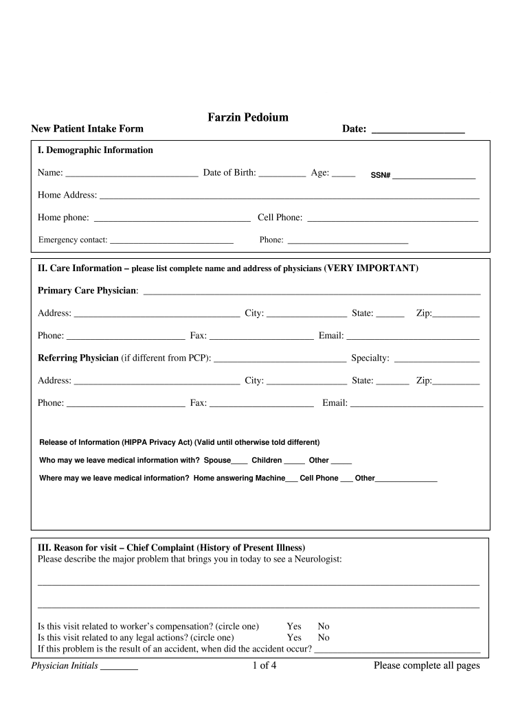 New Patient Intake Formalin PedoiumDate: I. Demographic Information Name: BWH Med Record # Name: Date of Birth: Age: BWH MAN # Age: Date of Birth: SSN# Headdress: Address: Home phone: Cell Phone: