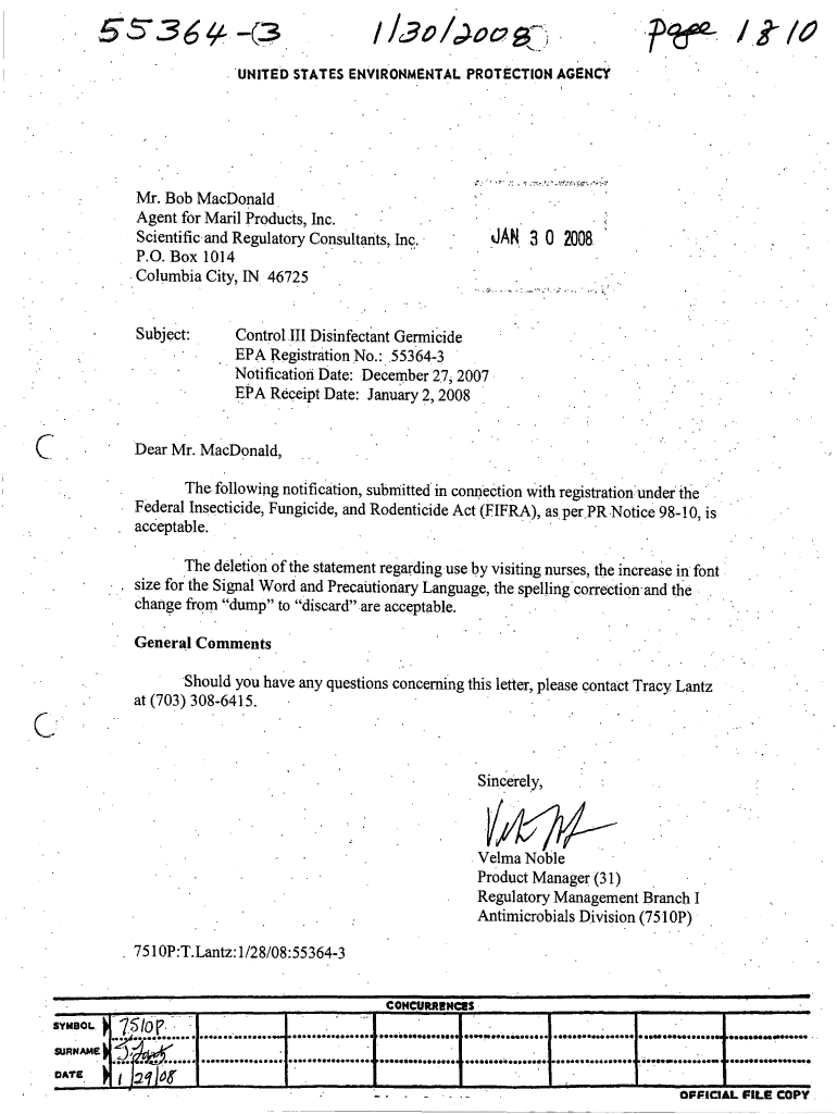 5S36tr.g/ /3tJ/).dog 'UNITED STATES ENVIRONMENTAL PROTECTION Agency Mr. Bob MacDonald Agent for Mail Products, Inc. Scientific and Regulatory Consultants, INS. ' P.O. Box 1014, Columbia City, IN 46725,JAN.