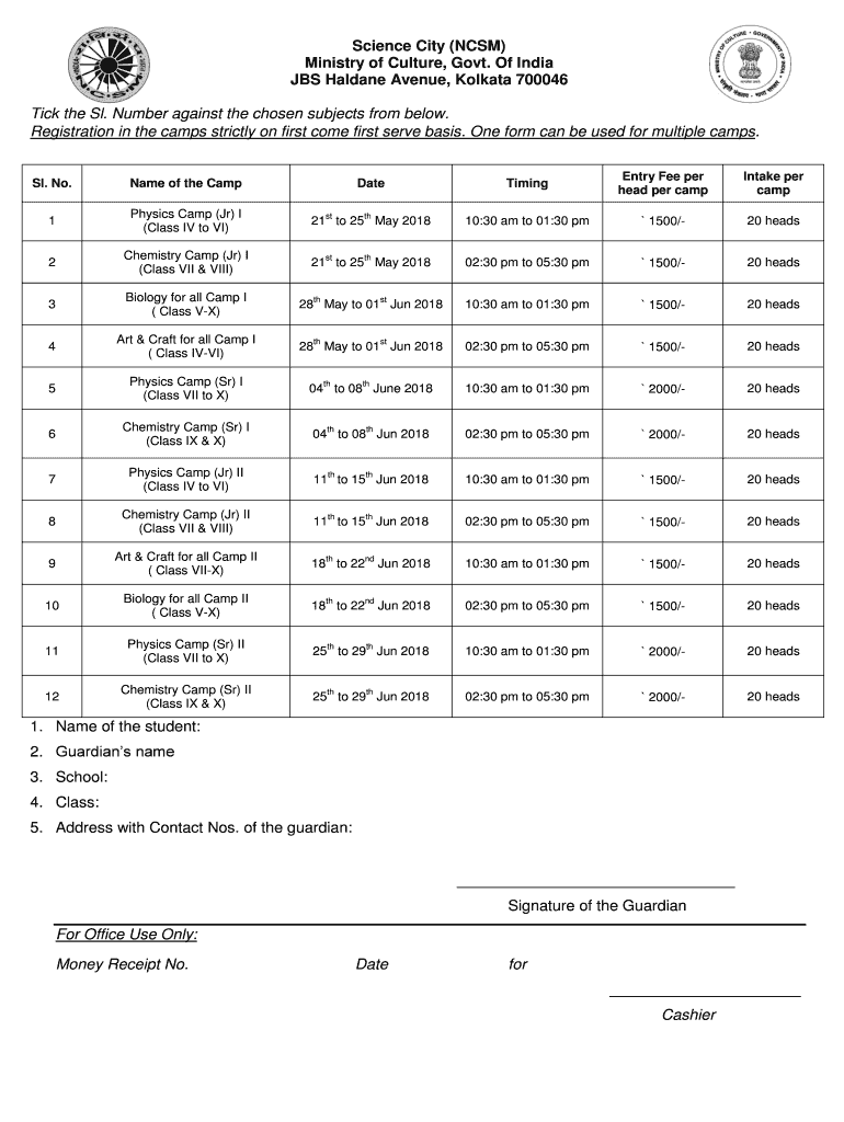 Science City (CCSM) Ministry of Culture, Govt. Of India JBS Haldane Avenue, Kolkata 700046 Tick the SL. Number against the chosen subjects from below. Registration in the camps strictly on first come,