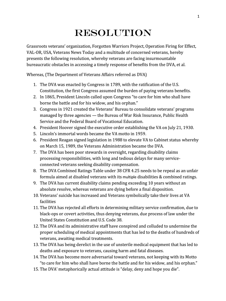 VALOR, USA, Veterans News Today and a multitude of concerned veterans, hereby