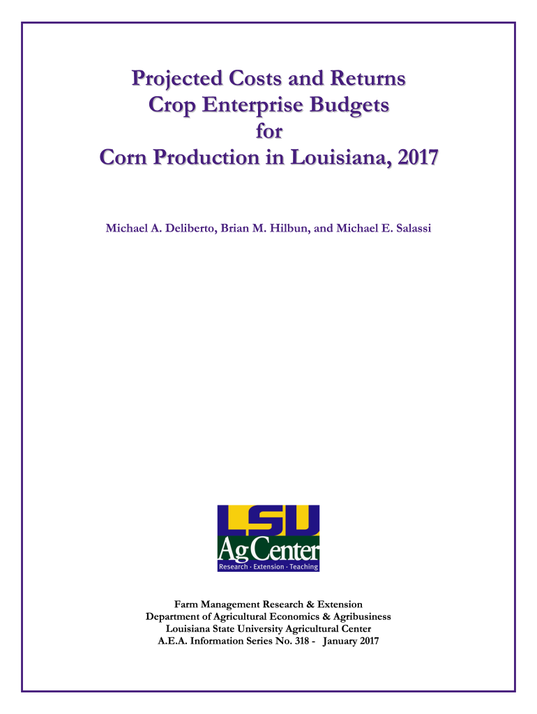 Projected Costs and Returns Crop Enterprise Budgets for Corn Production in Louisiana, 2017 Michael A. Deliberate, Brian M. Hilton, and Michael E. SalassiFarm Management Research & Extension Department