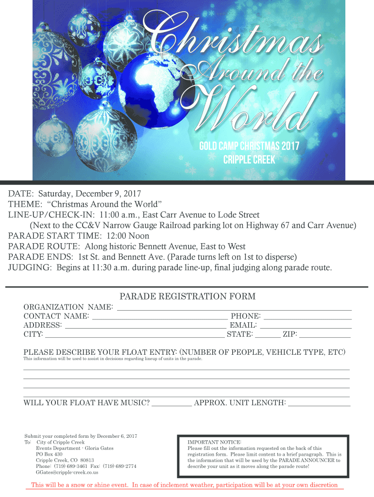 DATE: Saturday, December 9, 2017, THEME: Christmas Around the World LINEUP/CHECKING: 11:00 a.m., East Carr Avenue to Lode Street (Next to the CCTV Narrow Gauge Railroad parking lot on Highway 67 and