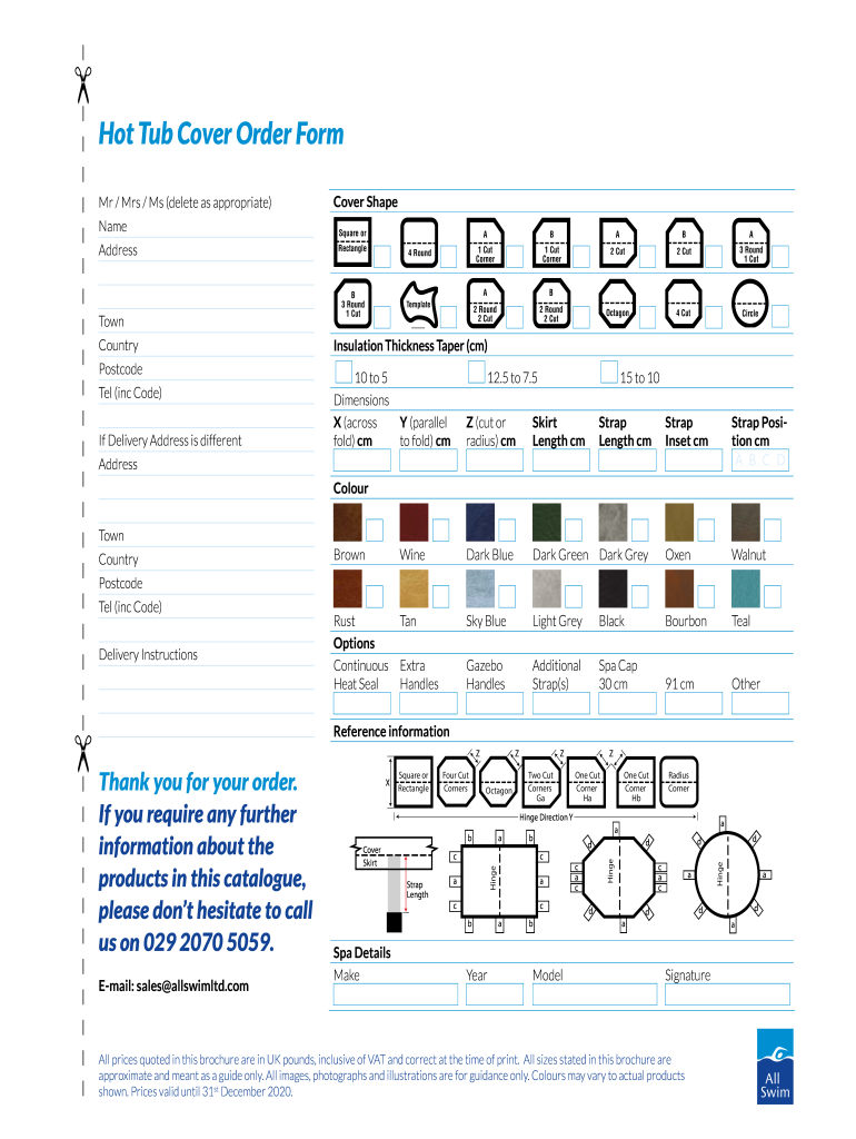 To fill out a hot tub cover order, one must provide details such as the hot tub's dimensions, model number, and specific cover preferences, along with personal contact information.