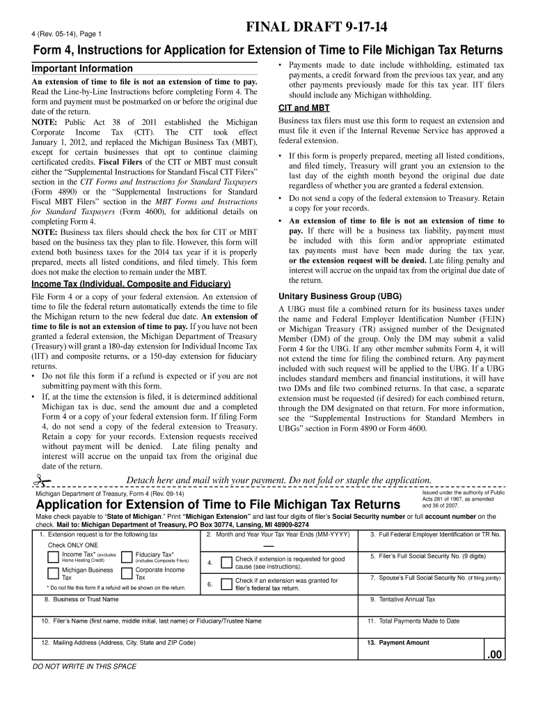 FINAL DRAFT 917144 (Rev. 0514), Page 1Form 4, Instructions for Application for Extension of Time to File Michigan Tax Returns