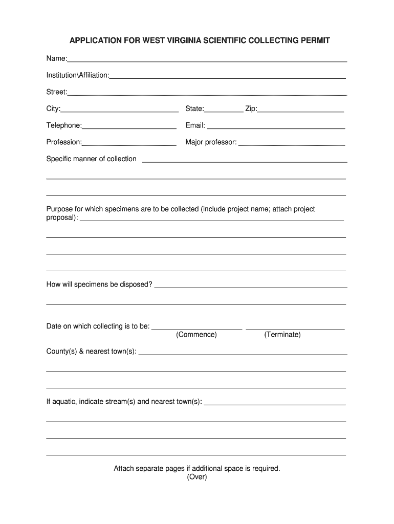 APPLICATION FOR WEST VIRGINIA SCIENTIFIC COLLECTING PERMIT Name: InstitutionAffiliation: Street: City: State: Zip: Telephone: Email: Profession: Major professor: Specific manner of collection Purpose