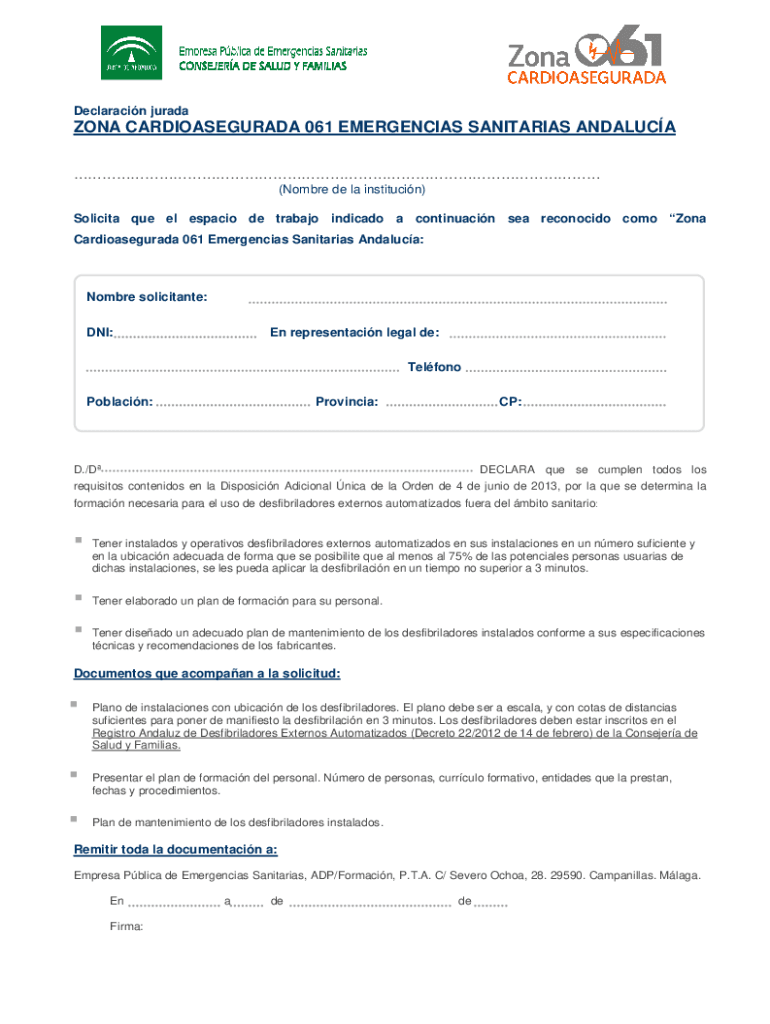 Declaration juradaZONA CARDIOASEGURADA 061 EMERGENCIES SANITARIAN ANDALUSIA (Hombre DE la institution) Solicit Que el ESPCI de tribal indicate a continuation sea reconcile Como Zone Cardioasegurada
